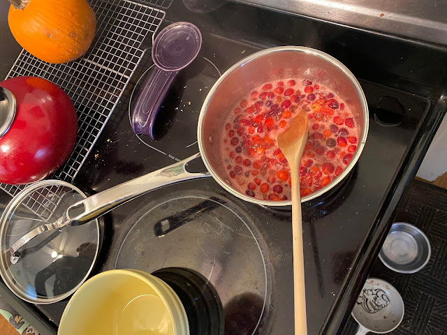 Dale made the cranberry sauce at around 9:30 a.m. It's the item that makes the most sense to make ahead of dinner since it can just sit in the fridge.